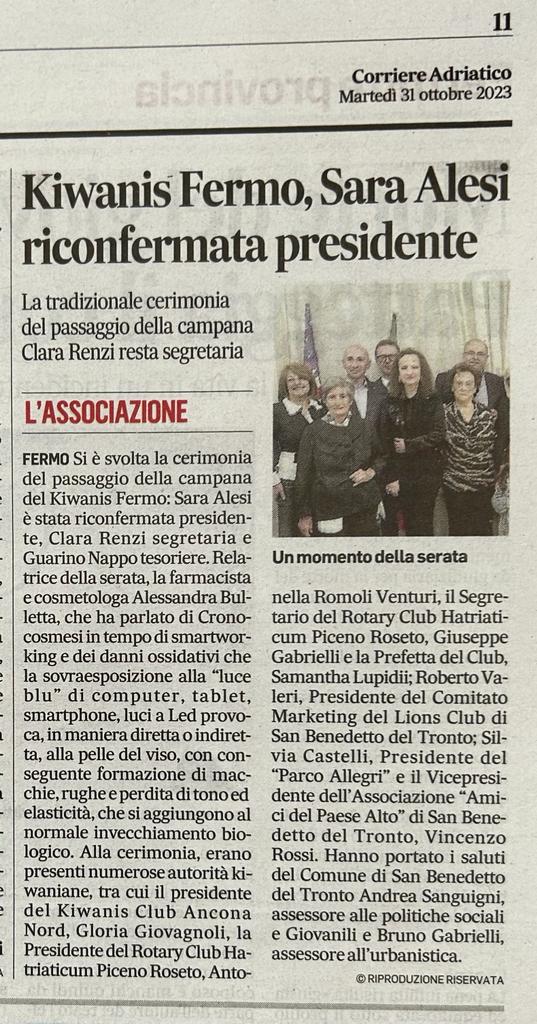 Si è svolta, all’Hotel Calabresi di San Benedetto del Tronto, la cerimonia del Passaggio della Campana del Kiwanis Fermo: durante l’evento, la farmacista e cosmetologa Alessandra Bulletta ha parlato di Cronocosmesi in tempo di smartworking e dei danni ossidativi che la sovraesposizione alla “luce blu” di computer, tablet, smartphone, luci a Led provoca alla pelle del viso, presentando la nuova linea cosmetica MELA PC. Guarda l’articolo anche su Laprovinciadifermo.com, Logos Notizie e Vivere Fermo.